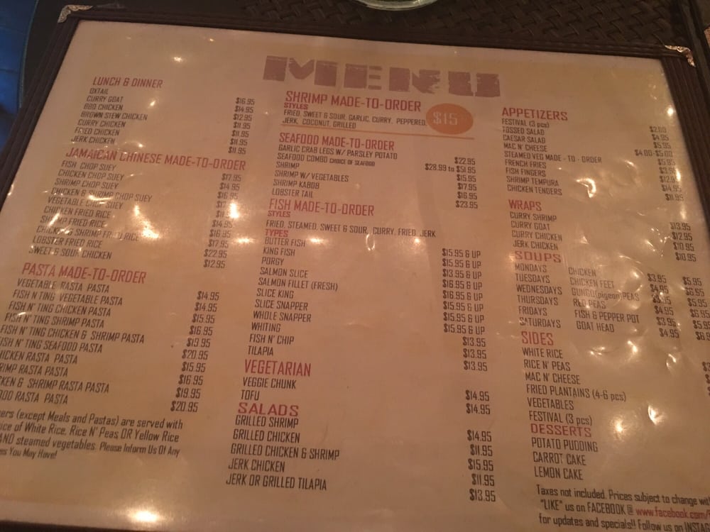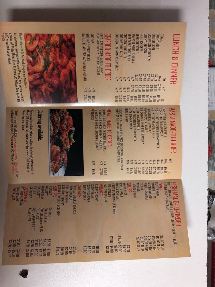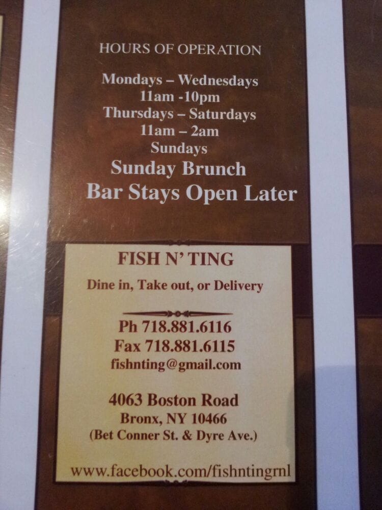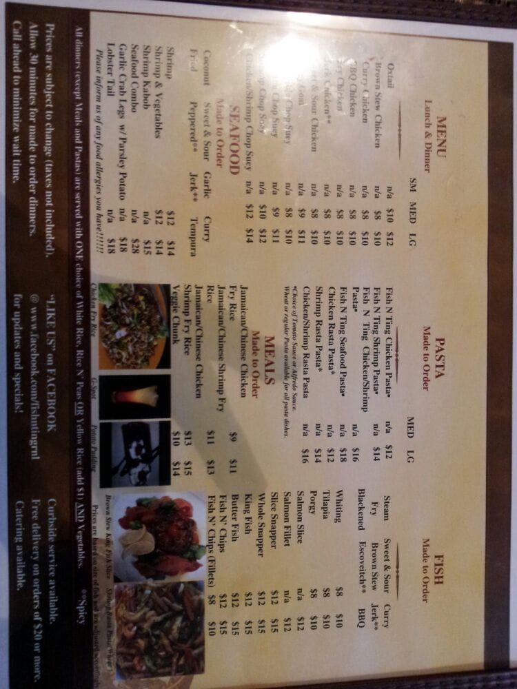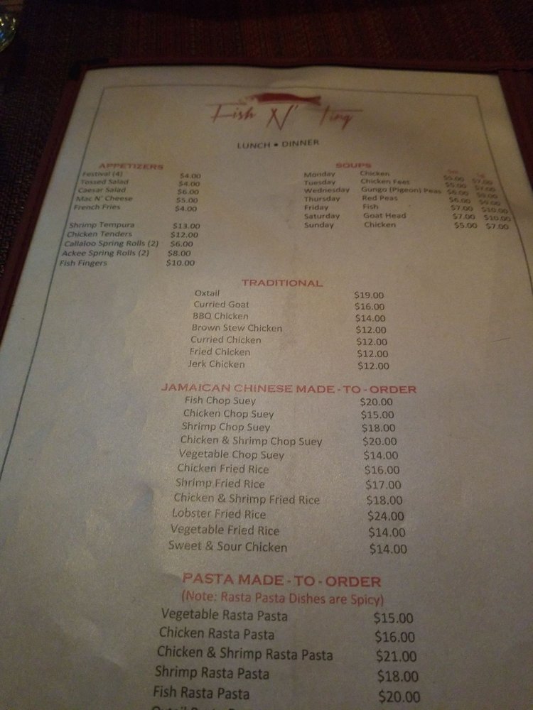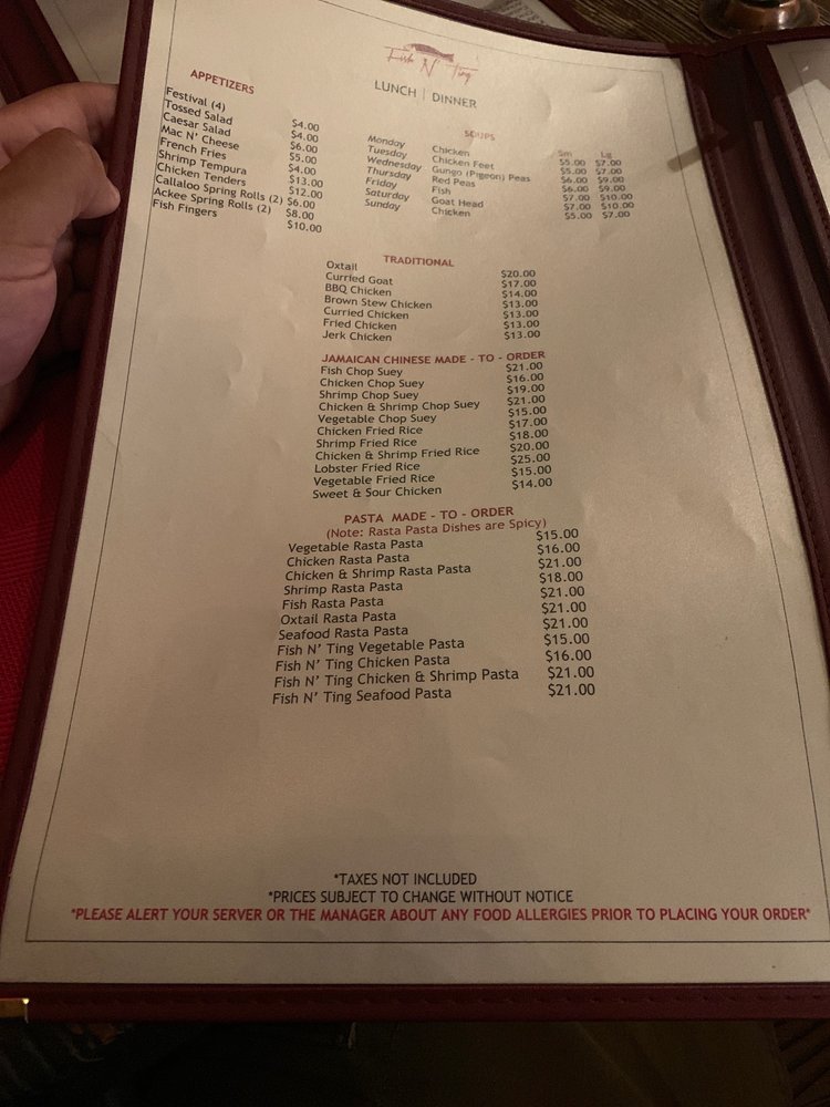 Fish N' Ting is a Caribbean restaurant located in Bronx, NY, known for its vibrant atmosphere and diverse menu. The lunch menu features popular dishes like Oxtail, Curry Goat, Jerk Chicken, and Vegetable Chop Suey. The soups, including Fish Soup and Red Peas with Chicken Feet, offer unique flavors that cater to different tastes. The salads, such as Jerk Chicken Salad and Grilled Shrimp Salad, provide a refreshing option for lighter meals. The restaurant also offers a range of amenities, from delivery and takeout options to catering services. With a full bar, happy hour specials, and entertainment like pool tables and TV, Fish N' Ting is the perfect spot for a casual yet enjoyable dining experience. Don't miss out on their delicious Caribbean-inspired dishes and inviting ambiance.